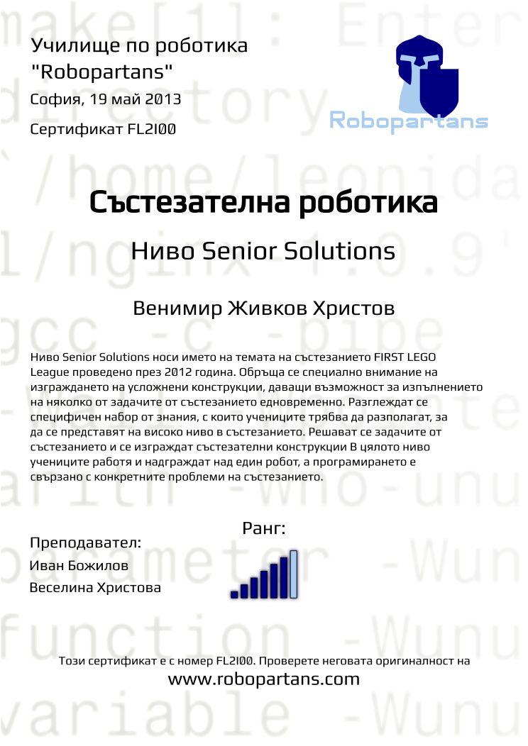 Retiffy certificate FL2I00 issued to Венимир Живков Христов from template Robopartans with values,city:София,teacher1:Иван Божилов,teacher2:Веселина Христова,name:Венимир Живков Христов,rank:6,date:19 май 2013
