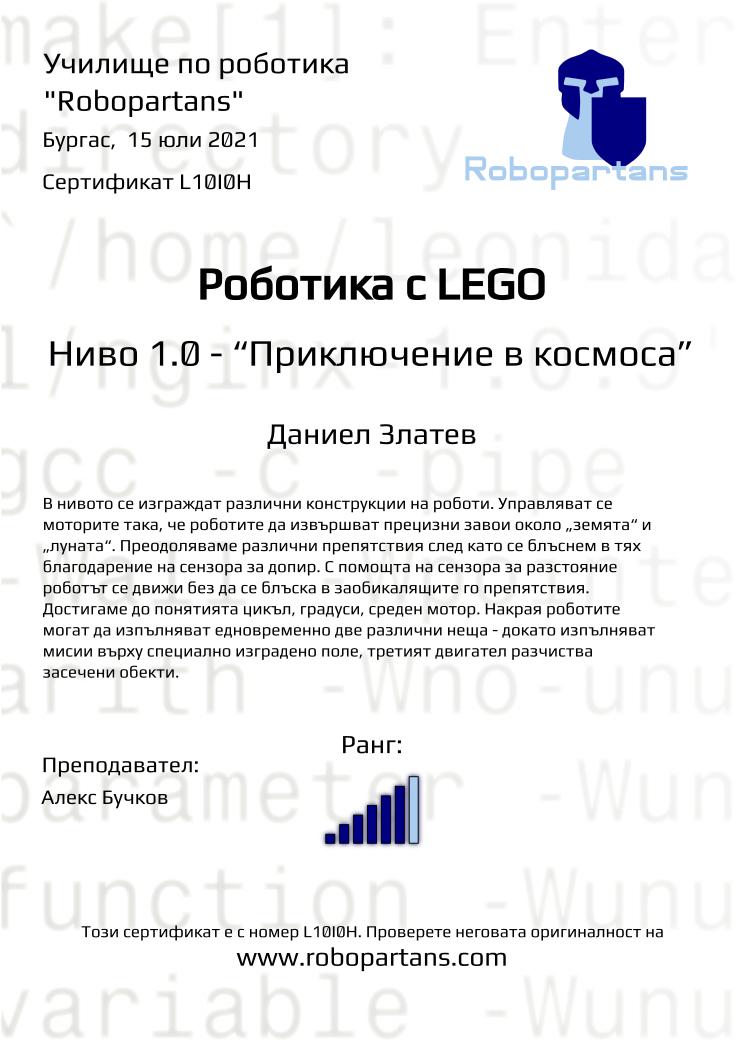 Certificate for the courses at school of robotics "Robopartans" |