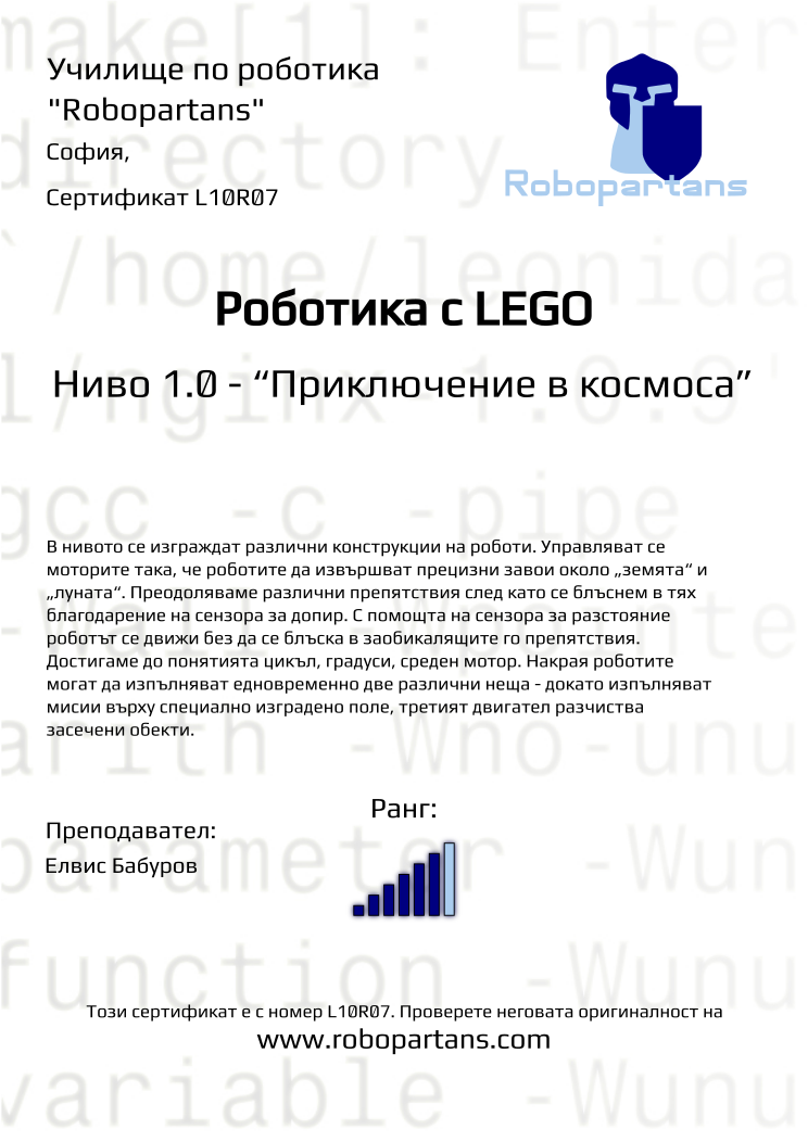 Retiffy certificate L10R07 issued to  from template Robopartans with values,city:София,rank:6,teacher1:Елвис Бабуров