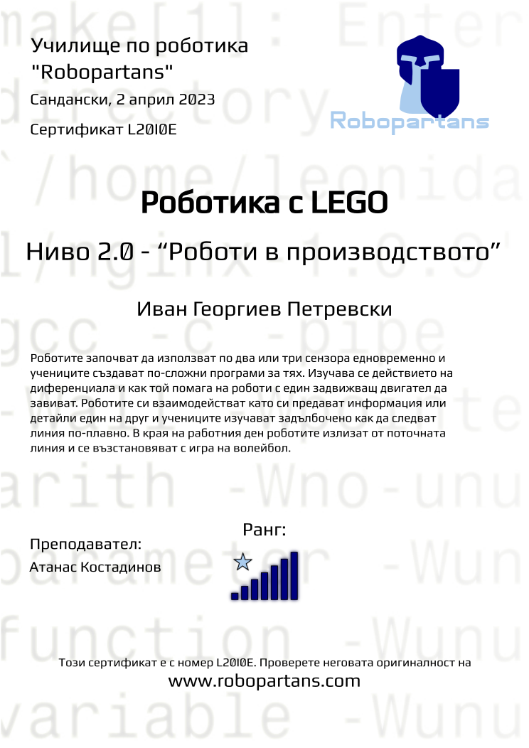 Retiffy certificate L20I0E issued to Иван Георгиев Петревски from template Robopartans with values,rank:7,city:Сандански,teacher1:Атанас Костадинов,name:Иван Георгиев Петревски,date:2 април 2023