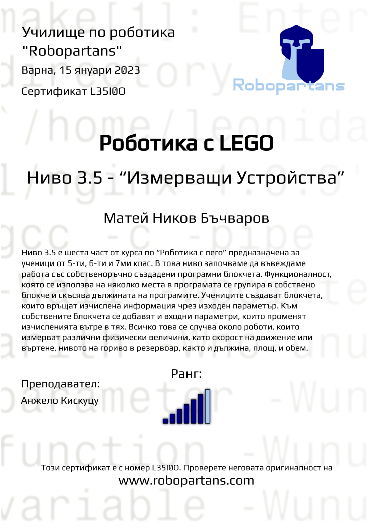 Retiffy certificate L35I0O issued to Матей Ников Бъчваров from template Robopartans with values,city:Варна,rank:6,name:Матей Ников Бъчваров,teacher1:Анжело Кискуцу,date:15 януари 2023