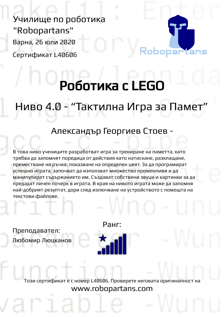 Retiffy certificate L40606 issued to Александър Георгиев Стоев - from template Robopartans with values,city:Варна,rank:8,teacher1:Любомир Люцканов,name:Александър Георгиев Стоев -,date:26 юли 2020