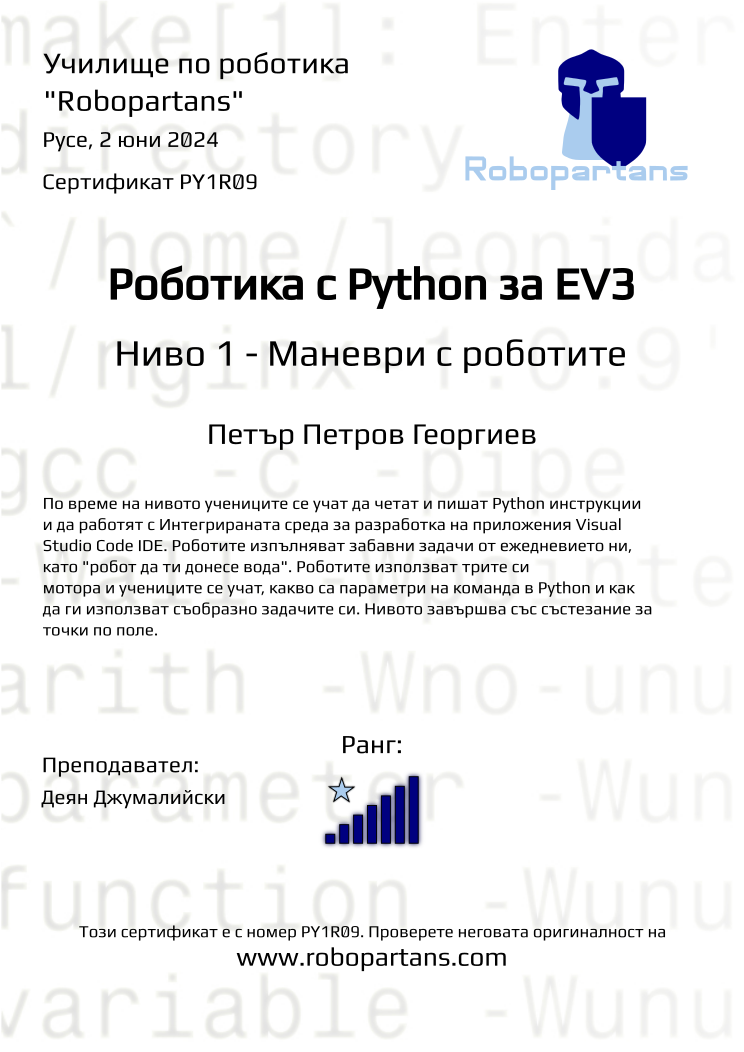 Retiffy certificate PY1R09 issued to Петър Петров Георгиев from template Robopartans with values,rank:7,name:Петър Петров Георгиев,city:Русе,teacher1:Деян Джумалийски,date:2 юни 2024