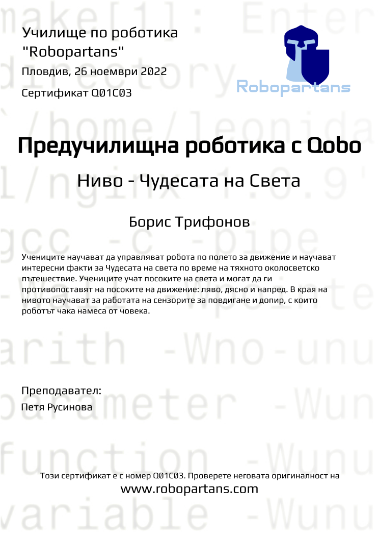 Retiffy certificate Q01C03 issued to Борис Трифонов from template Robopartans with values,city:Пловдив,teacher1:Петя Русинова,date:26 ноември 2022,name:Борис Трифонов