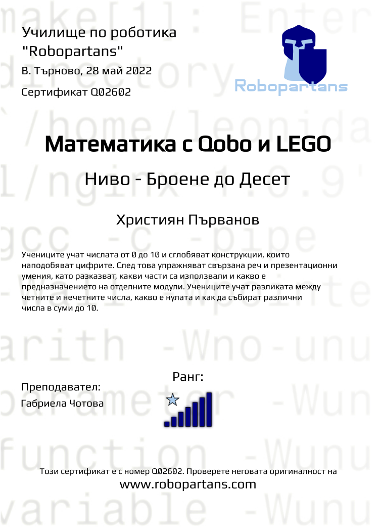 Retiffy certificate Q02602 issued to Християн Първанов from template Robopartans with values,rank:7,teacher1:Габриела Чотова,city:В. Търново,name:Християн Първанов,date:28 май 2022