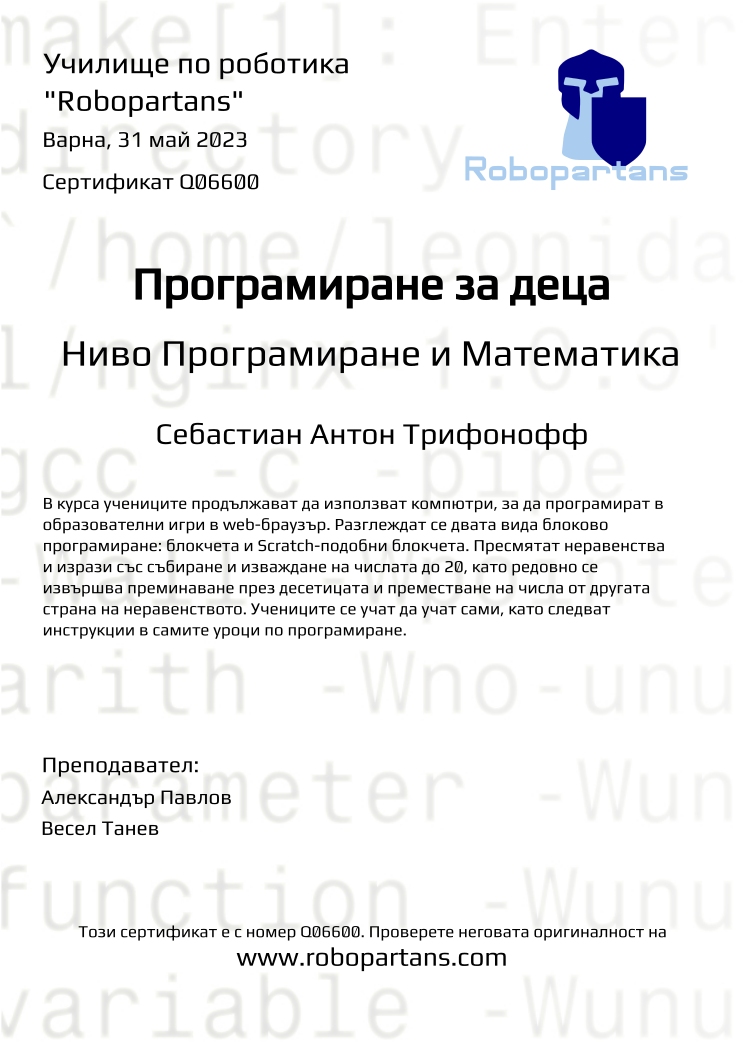 Retiffy certificate Q06600 issued to Себастиан Антон Трифонофф from template Robopartans with values,city:Варна,teacher1:Александър Павлов,name:Себастиан Антон Трифонофф,date:31 май 2023,teacher2:Весел Танев