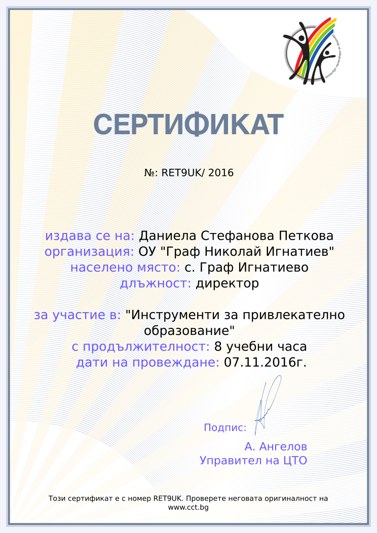 Retiffy certificate RET9UK issued to Даниела Стефанова Петкова from template Teacher_training_2016 with values,position:директор,city:с. Граф Игнатиево,url:www.cct.bg,template:Teacher_training_2016,name:Даниела Стефанова Петкова,school:ОУ "Граф Николай Игнатиев",course:"Инструменти за привлекателно образование",duration:8 учебни часа,dates:07.11.2016г.