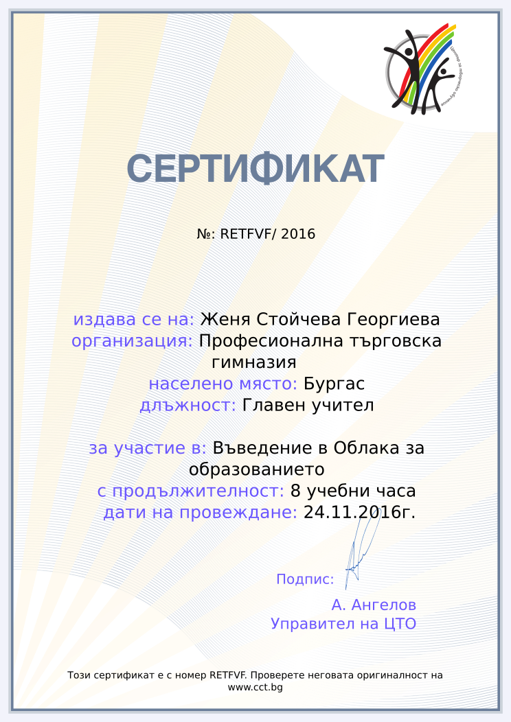 Retiffy certificate RETFVF issued to Женя Стойчева Георгиева from template Teacher_training_2016 with values,city:Бургас,position:Главен учител,url:www.cct.bg,template:Teacher_training_2016,duration:8 учебни часа,name:Женя Стойчева Георгиева,school:Професионална търговска гимназия ,course:Въведение в Облака за образованието,dates:24.11.2016г.