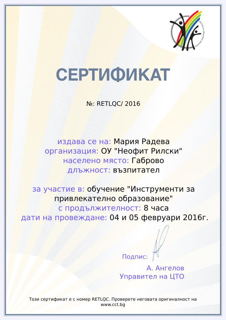 Retiffy certificate RETLQC issued to Мария Радева from template Teacher_training_2016 with values,position:възпитател,url:www.cct.bg,template:Teacher_training_2016,course:обучение "Инструменти за привлекателно образование",duration:8 часа,name:Мария Радева,school:ОУ "Неофит Рилски",city:Габрово,dates:04 и 05 февруари 2016г.