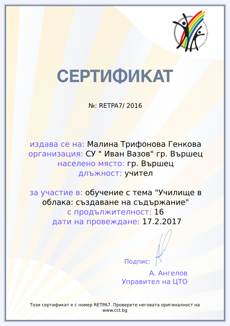 Retiffy certificate RETPA7 issued to Малина Трифонова Генкова from template Teacher_training_2016 with values,position:учител,url:www.cct.bg,template:Teacher_training_2016,name:Малина Трифонова Генкова,duration:16,school:СУ " Иван Вазов" гр. Вършец,city:гр. Вършец,course:обучение с тема "Училище в облака: създаване на съдържание",dates:17.2.2017