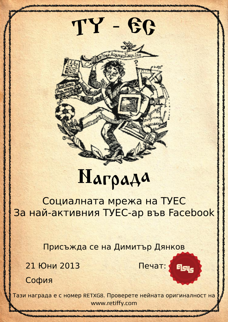 Retiffy certificate RETXG8 issued to Димитър Дянков from template Elsys awards template with values,city:София,template:Elsys awards template,name:Димитър Дянков,date:21 Юни 2013,line1:Социалната мрежа на ТУЕС,line2:За най-активния ТУЕС-ар във Facebook