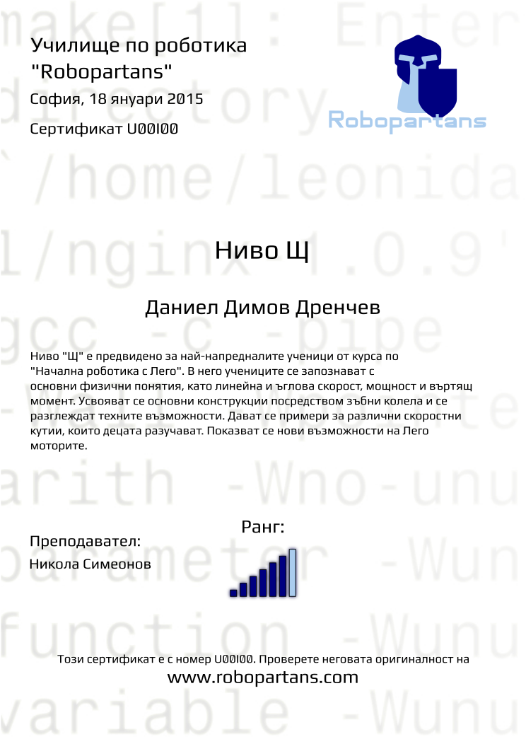 Retiffy certificate U00I00 issued to Даниел Димов Дренчев from template Robopartans with values,city:София,teacher1:Никола Симеонов,rank:6,name:Даниел Димов Дренчев,date:18 януари 2015