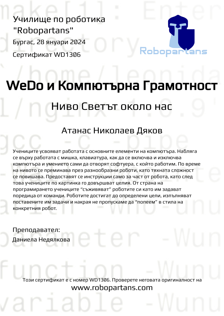 Retiffy certificate WD1306 issued to Атанас Николаев Дяков from template Robopartans with values,city:Бургас,name:Атанас Николаев Дяков,date:28 януари 2024,teacher1:Даниела Недялкова