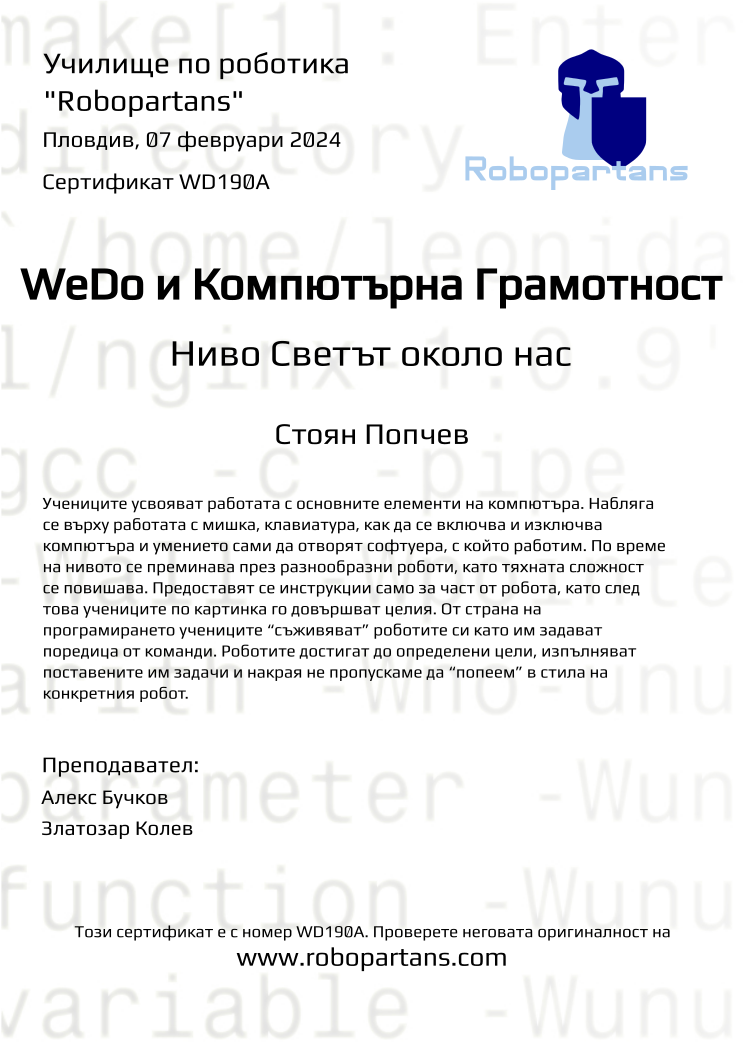 Retiffy certificate WD190A issued to Стоян Попчев from template Robopartans with values,city:Пловдив,teacher1:Алекс Бучков,teacher2:Златозар Колев,name:Стоян Попчев,date:07 февруари 2024
