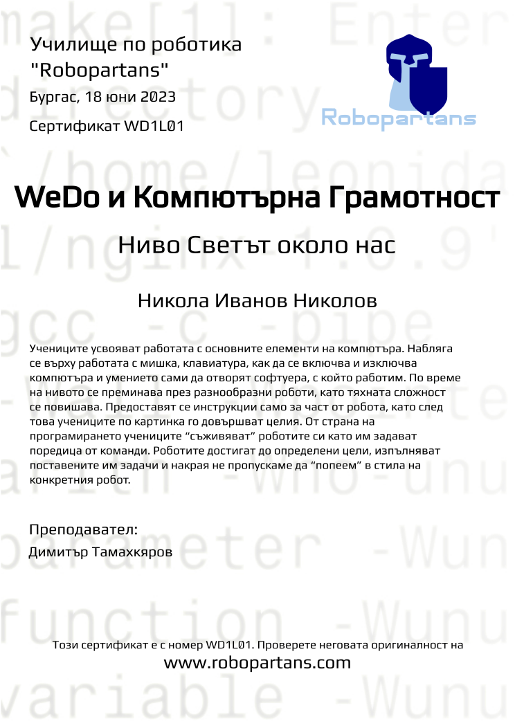 Retiffy certificate WD1L01 issued to Никола Иванов Николов from template Robopartans with values,city:Бургас,teacher1:Димитър Тамахкяров,name:Никола Иванов Николов,date:18 юни 2023