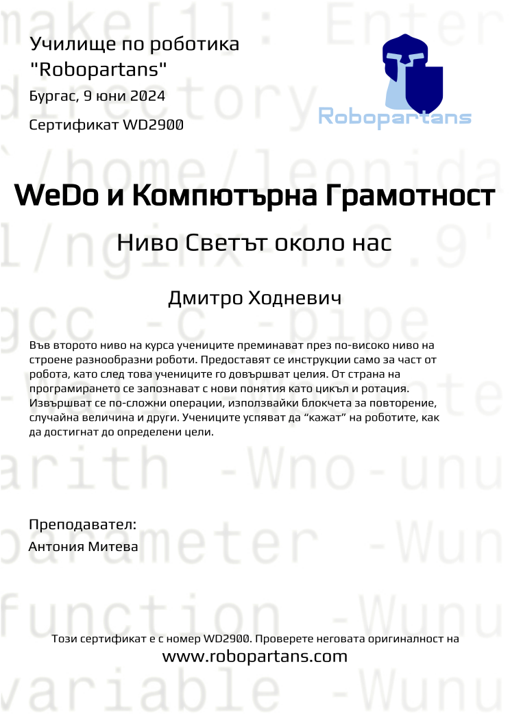 Retiffy certificate WD2900 issued to Дмитро Ходневич from template Robopartans with values,city:Бургас,name:Дмитро Ходневич,date:9 юни 2024,teacher1:Антония Митева