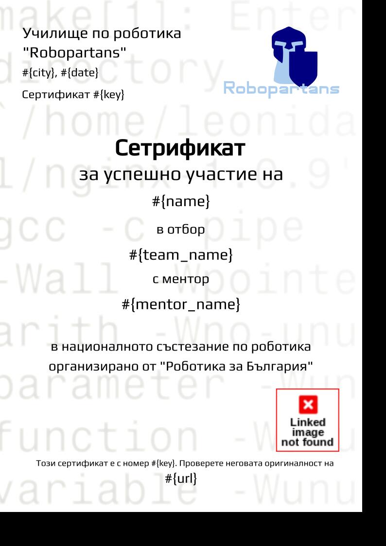 This certificate is given to students that have participated in the national robotics competition organized by Robotika za Bulgaria