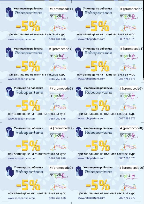 Promocodes for 5% discount Robopartans Sofia templatePromocodes for 5% discount for Robopartans Sofia classeshttp://www.robopartans.comOnly owners of this template can issue certificates from it. |